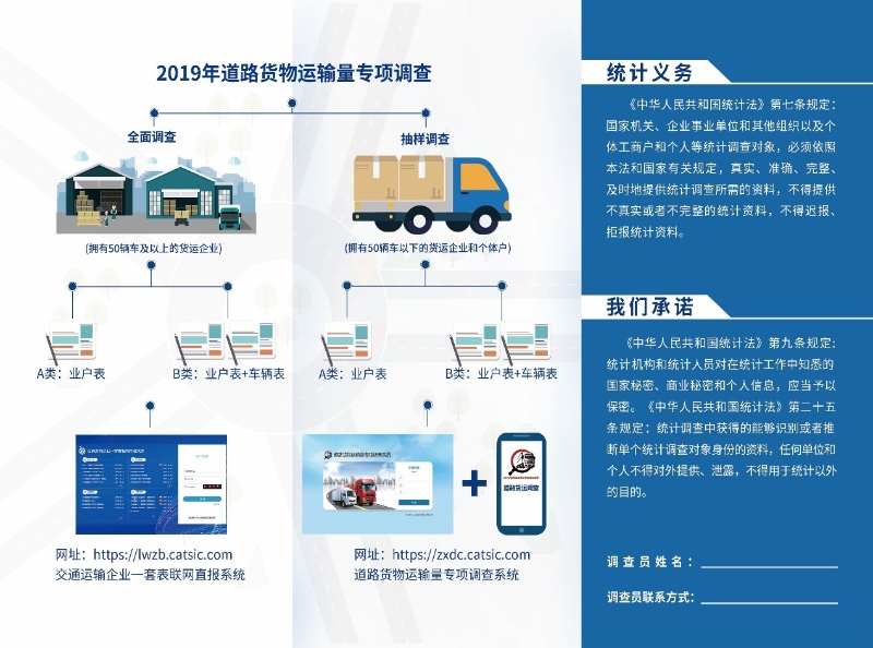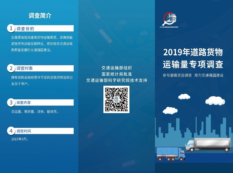为配合做好全国第四次经济普查和地区生产总值统一核算改革工作,全面摸清山东省道路货物运输家底,推进山东交通高质量发展和交通强省建设,进一步提高道路货物运输量统计数据的真实性和准确性,在交通运输部的统一组织下,我省将于2019年9月在全省范围内开展道路货物运输量专项调查工作。