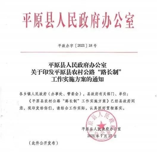 制度规范化。结合平原县实际,建立覆盖县、乡、村三级公路的路长管理体系,构建起责任明确、协调有序、监管严格、奖惩有力的路长管理机制。县政府主要领导同志担任县级总路长,有关县领导同志担任副总路长,副县级领导担任县级路长,乡镇(街道)主要负责人担任乡级总路长,村庄党支部书记或村委会主任担任村级路长。