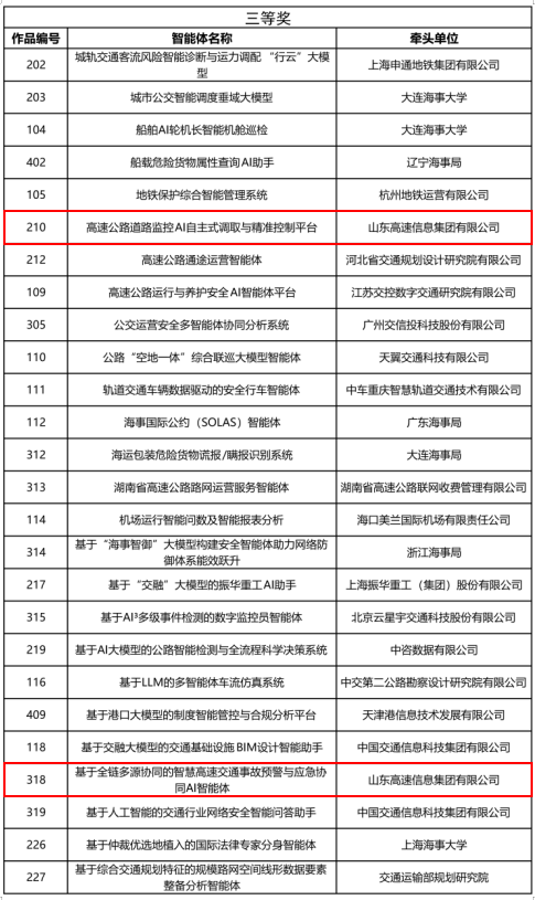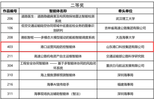 经现场答辩、专家提问等环节,由山东省交通运输厅联合山东综合交通数据运营中心、山东省港口集团有限公司、山东港口陆海国际物流集团有限公司、山东省数智交通科技有限公司等单位,围绕公路水路基础设施数字化转型升级,依托自研“堑驰”综合交通多模态大模型和“天驷”智能体中台打造的“基于AI大模型+危化品全程物流供应链综合服务应用”智能体荣获大赛一等奖。