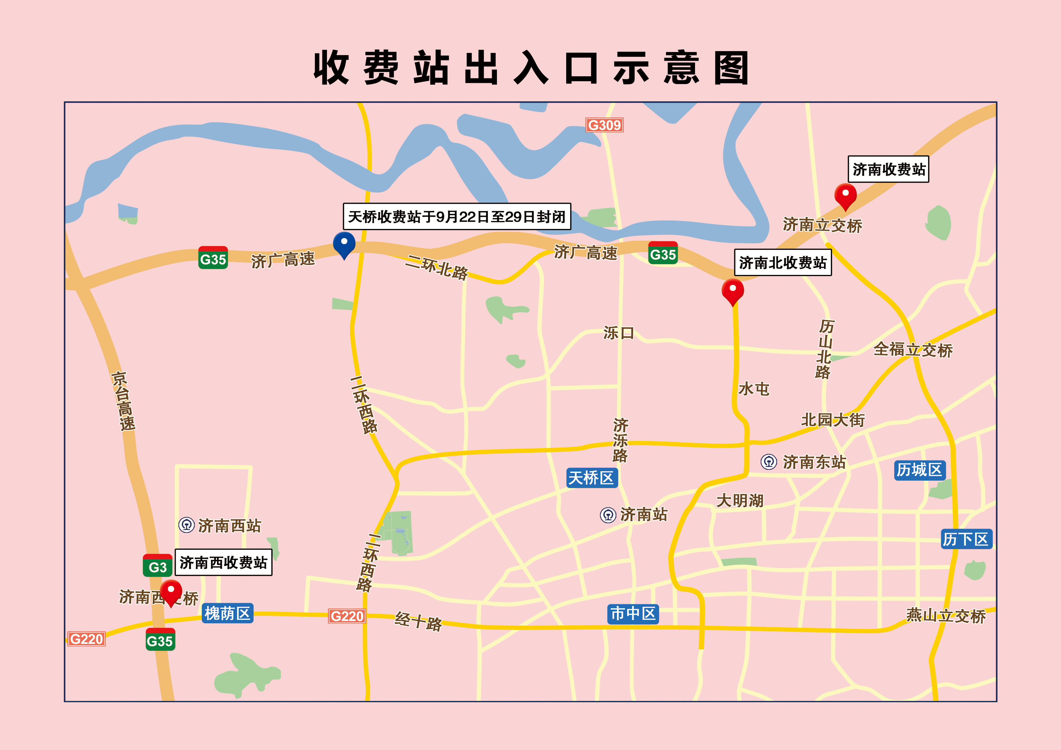 2、客车、小型车辆可选择G2001即G3(京台高速)济南西收费站、G35(济广高速)济南收费站(原零点收费站)以及济南北收费站上下高速。