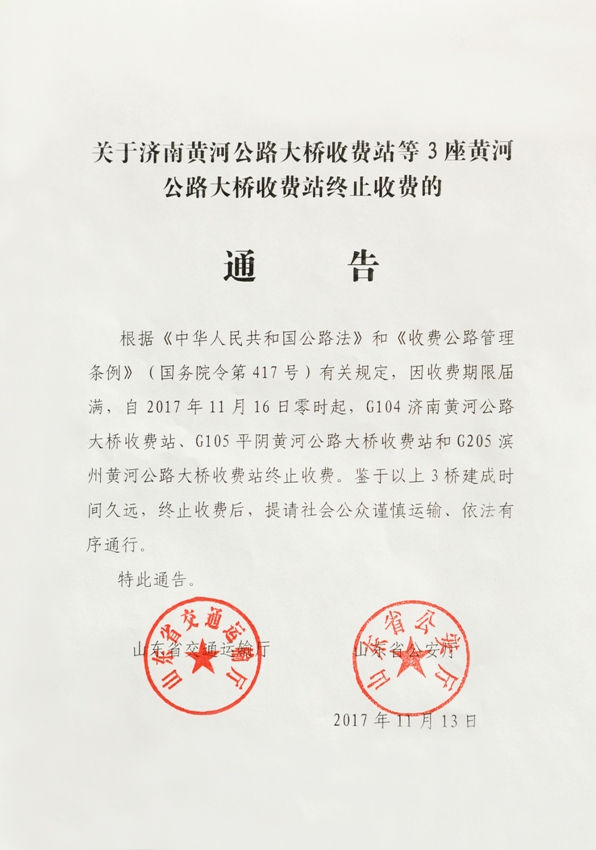关于济南黄河公路大桥收费站等3座黄河公路大桥收费站终止收费的通告