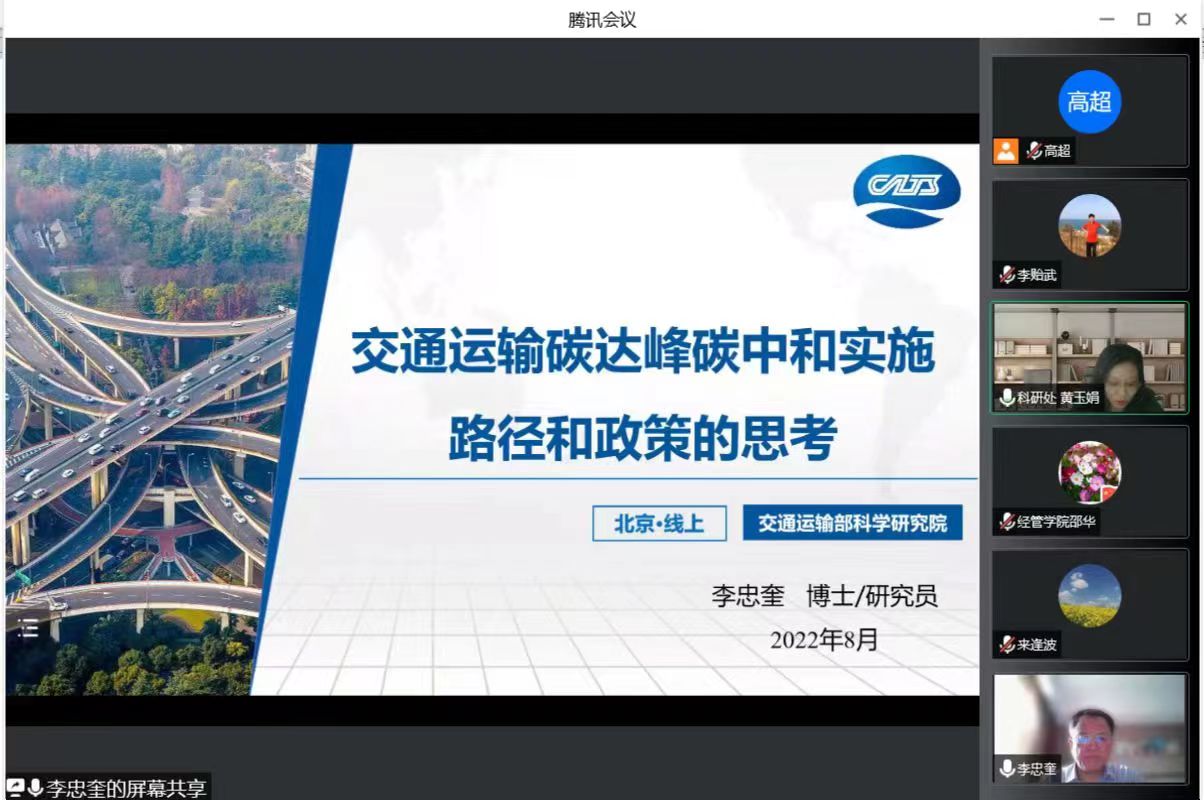 本次研讨会以“双碳交通 强国示范”为主题,围绕交通运输领域政策文件、时政热点、前沿科学问题以及关键技术等开展交流。交通运输部科学研究院交通发展研究中心主任李忠奎作了题为《交通运输碳达峰碳中和路径和政策思考》的报告,解读了碳达峰碳中和相关政策、交通运输领域碳排放计划,介绍了碳达峰碳中和工作推进情况,分析了推动减污降碳协同增效的实施路径;山东省交通规划设计院副院长李贻武作了《<加快建设交通强国山东示范区工作方案>解读》报告,介绍了加快建设交通强国山东示范区的总体要求,并对具体工作任务、推进行动方案和保障措施进行逐一解读;东南大学交通学院副院长刘志远教授以《智慧交通数字孪生中的关键科学问题与技术方法》为题,讲解了交通数字孪生技术的发展进程、关键问题、发展和制约因素以及实际应用案例。