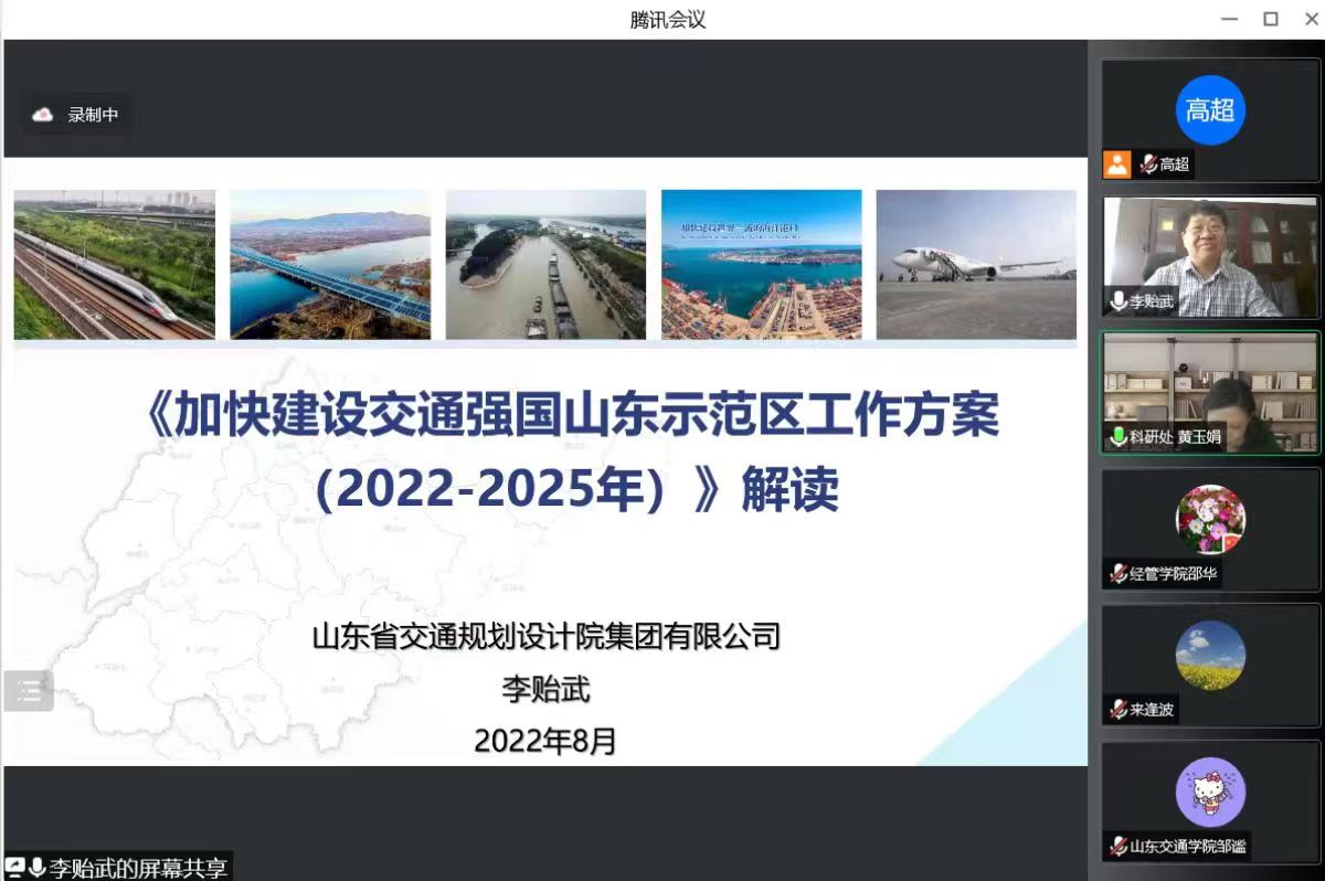 近日,山东交通运输智库联盟第一届研讨会召开。会议由山东省交通运输厅指导,由山东交通学院和山东交通运输智库联盟主办、黄河流域高校交通运输科创联盟协办,采取线上视频形式,来自高校、科研院所和行业部门的专家学者共计300余人参加研讨会。