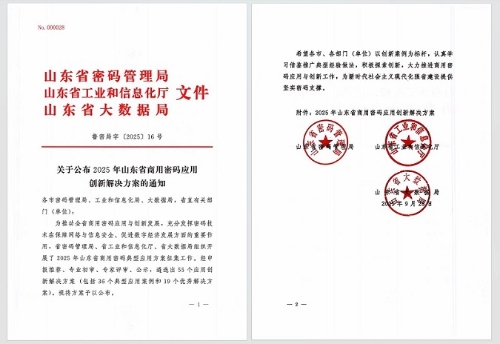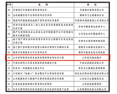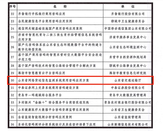 近日,省密码管理局、省工业和信息化厅、省大数据局组织开展的2025年度山东省商用密码典型应用创新方案评选结果公示。省交通运输厅组织申报的“山东省网络货运信息检测系统商用密码应用方案”获评典型创新应用案例。