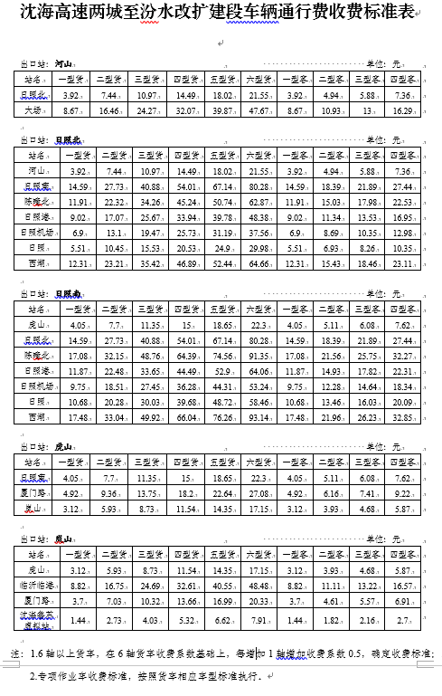一、沈海高速两城至汾水改扩建段车辆通行费标准详见附件。