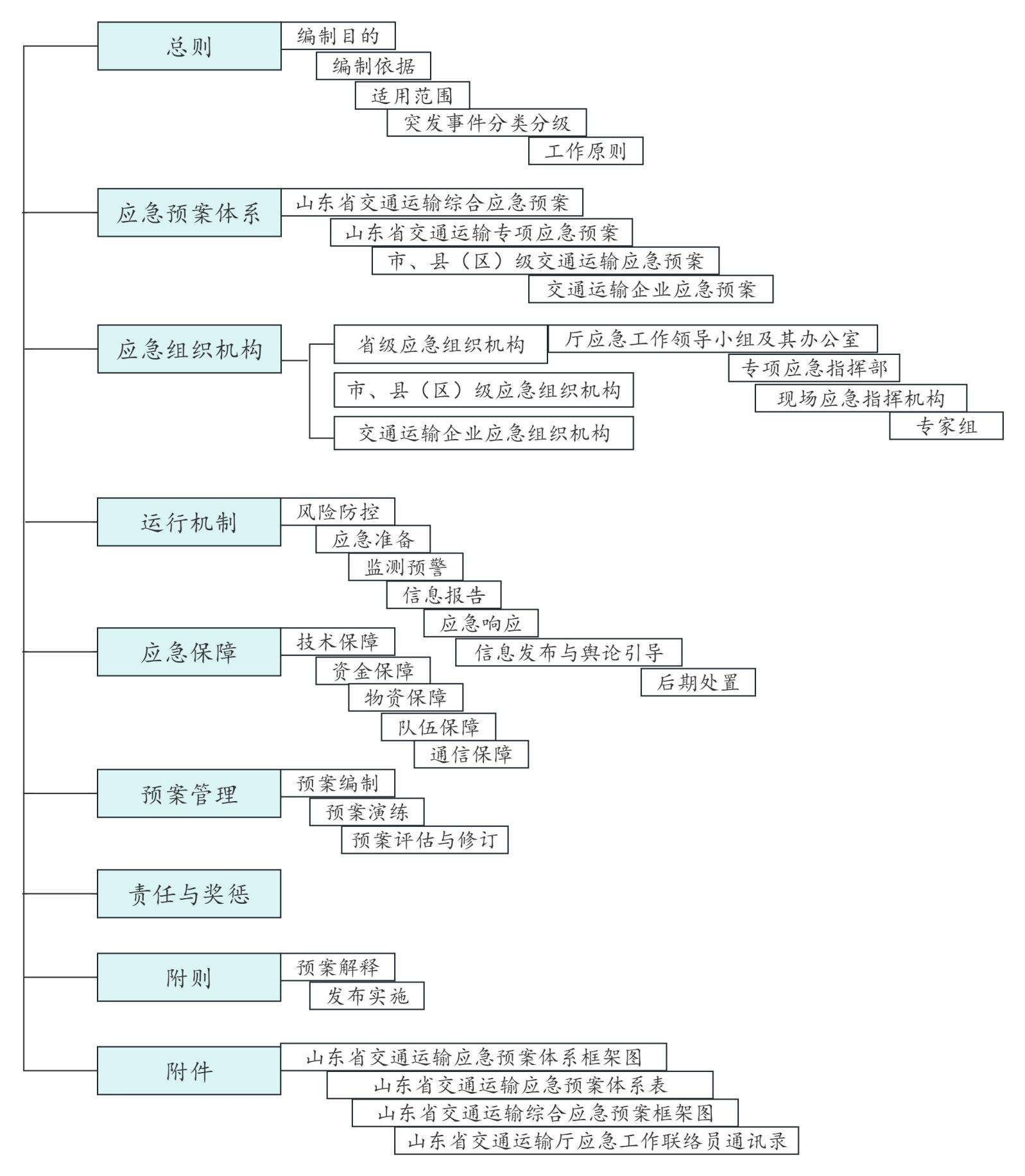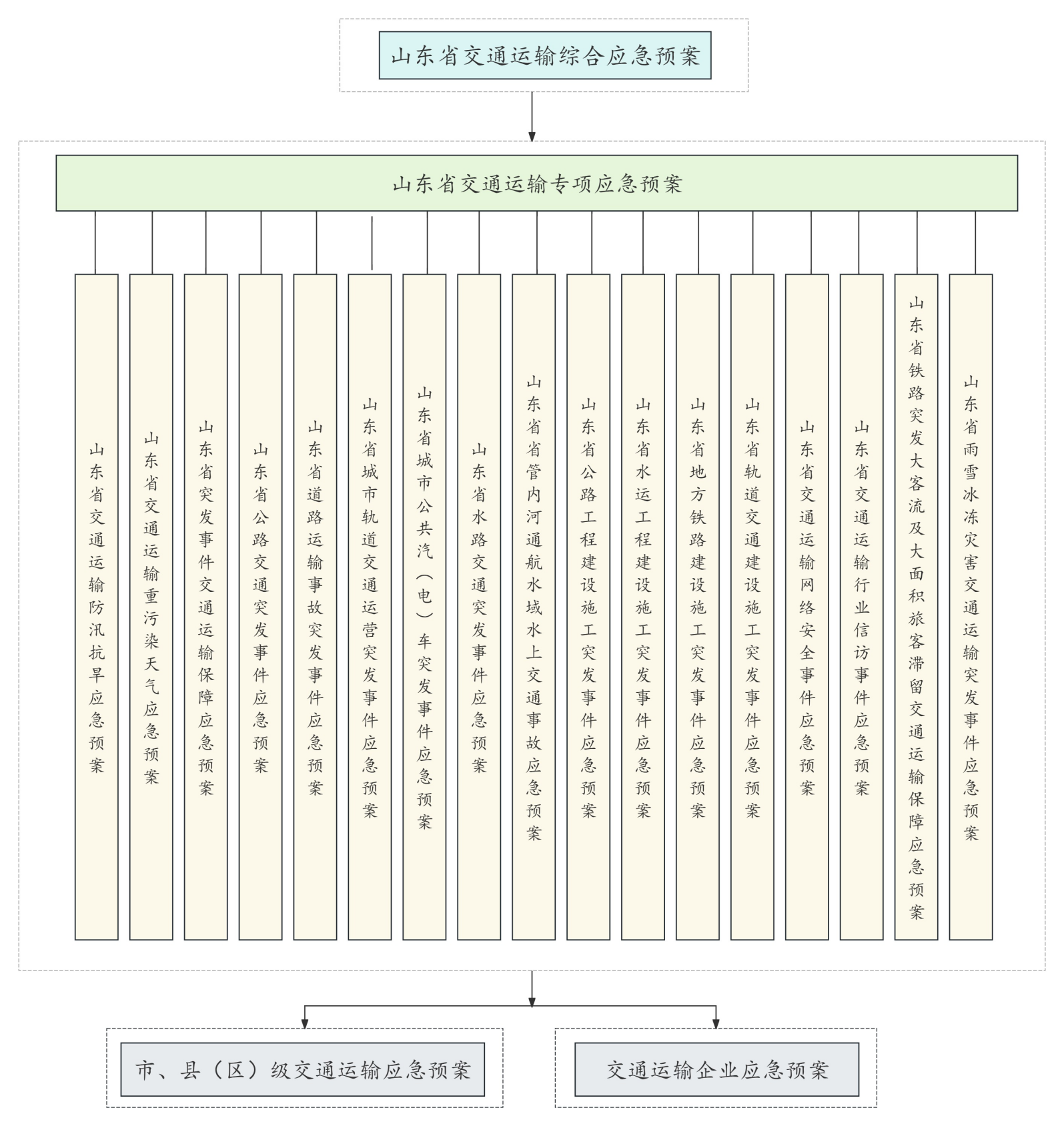 山东省交通运输应急预案体系(应急预案体系框架图及体系表见附件1和附件2)包括山东省交通运输综合应急预案,山东省交通运输各专项应急预案,市、县(区)级交通运输应急预案,交通运输企业应急预案。