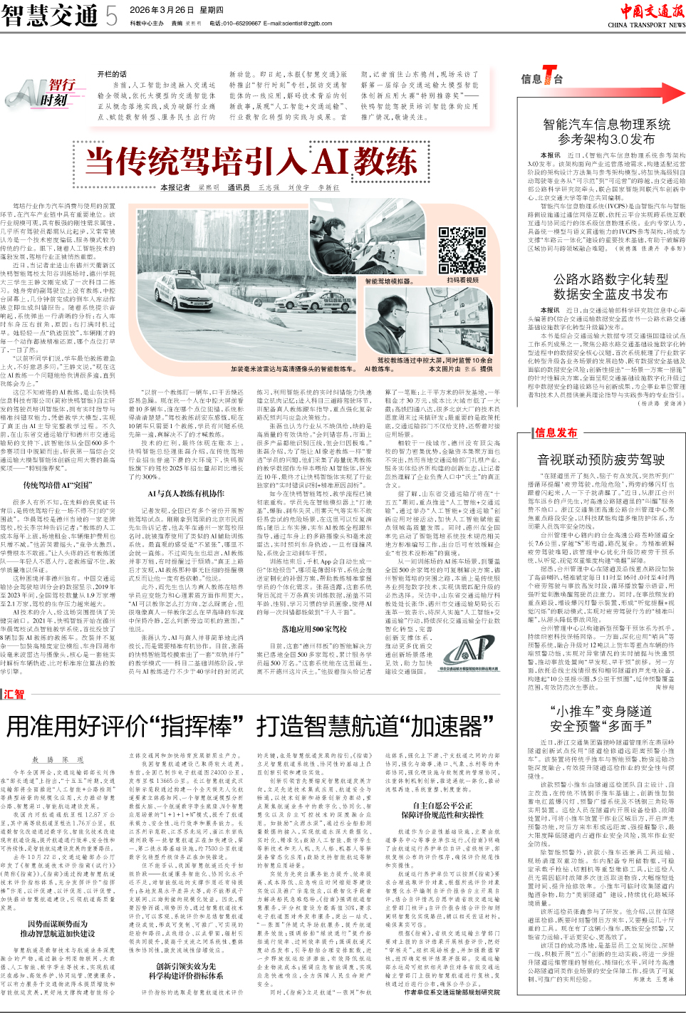 从一间训练场的AI练车场景,到覆盖全国500余家驾校的可复制解决方案,德州智能驾培的突围之路,本质上是传统服务业拥抱数字技术、实现供需匹配升级的必然选择。采访中,山东省交通运输厅科教处处长张华、德州市交通运输局局长石连革一致表示,将深入实施“人工智能﹢交通运输”行动,持续深化交通运输全行业数智化转型,完善创新支撑体系,推动更多优质交通创新场景落地见效,助力加快建设交通强国。